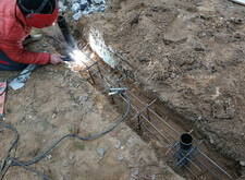 В траншею укладываем арматурную сетку, приварив её к только что вкрученным сваям.